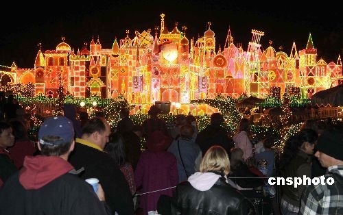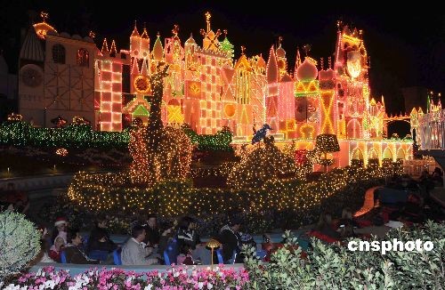 十二月二十三日晚,加州迪斯尼樂園以盛大的燈飾秀吸引眾多游客。美國經(jīng)濟(jì)持續(xù)不景氣,各類主題公園的生意蒙上陰影。為了抵御經(jīng)濟(jì)衰退帶來的民眾消費(fèi)力下降,加州迪斯尼樂園在圣誕假期推出一系列新穎節(jié)目和促銷活動,招攬更多游客。中新社發(fā) 張煒 攝