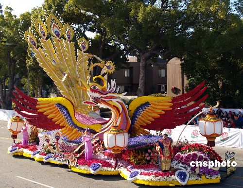 當(dāng)?shù)貢r間1月1日,第120屆美國帕薩迪娜玫瑰花車游行拉開2009新年序幕。游行隊(duì)伍由90個方陣組成,包括46輛花車、22支軍樂隊(duì)、18支騎術(shù)隊(duì)和5輛禮賓車,美輪美奐,精彩紛呈。臺灣中華航空公司的玫瑰花車“火鳳凰”,在花車游行中勇奪國際大獎。該花車名為“臺灣燈會”,花車上凸顯中國燈籠和“仙女下凡”,奪人眼球。中新社發(fā) 盧威 攝