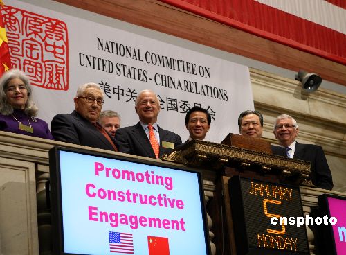 美國(guó)紐約證券交易所5日舉行紀(jì)念儀式慶祝中美建交30周年,美中關(guān)系全國(guó)委員會(huì)會(huì)長(zhǎng)歐倫斯(左四)敲響開(kāi)市鐘,中國(guó)常駐聯(lián)合國(guó)代表張業(yè)遂(右三)、中國(guó)駐紐約總領(lǐng)事館總領(lǐng)事彭克玉(右二)、美國(guó)前國(guó)務(wù)卿基辛格(左二)、美國(guó)NBA總裁斯特恩(右一)、紐交所執(zhí)行總裁尼德奧爾(左三)、美中關(guān)系全國(guó)委員會(huì)副會(huì)長(zhǎng)白莉娟(左一)等出席儀式。中新社發(fā) 李靜 攝