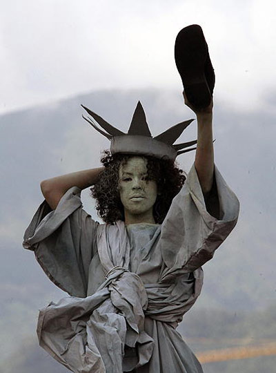 1月8日,在委內(nèi)瑞拉首都加拉加斯的以色列大使館前,一名裝扮成自由女神的女子手舉一只鞋子,抗議以色列在加沙地帶展開的軍事行動。