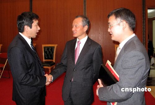 近日,中國駐日本大使崔天凱在東京舉辦2009旅日華僑華人新春招待會(huì)。會(huì)上,崔大使親切會(huì)見了日本人漢語征文大賽主辦者和贊助單位負(fù)責(zé)人,聽取他們的匯報(bào)。圖為崔大使會(huì)見大賽贊助單位社長。中新社發(fā) 段躍中 攝