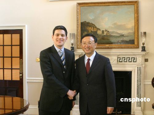 當(dāng)?shù)貢r(shí)間二月一日下午,陪同溫家寶總理訪英的中國(guó)外長(zhǎng)楊潔篪在倫敦會(huì)晤英國(guó)外交大臣米利班德。中新社發(fā) 張朔 攝