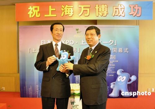 4月13日下午,日本“上海世博推介周”中的重要環(huán)節(jié)——“上海與上海世博會(huì)”圖片展,在東京羽田機(jī)場(chǎng)開幕。圖片展將持續(xù)到本月底,計(jì)劃在羽田機(jī)場(chǎng)、京濱急行列車“世博號(hào)”以及其他東京地鐵列車和站臺(tái)上展出反映上海城市風(fēng)情、市民生活、世博籌備等各方面的圖片共700幅,以讓日本市民直觀、生動(dòng)地了解上海與上海世博會(huì)的最新情況。圖為上海世博會(huì)執(zhí)委會(huì)常務(wù)副主任、上海市常務(wù)副市長楊雄(右),向東京都副知事菅原秀夫贈(zèng)送上海世博會(huì)吉祥物海寶。中新社發(fā) 關(guān)妍 攝