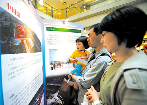 相比往年,本次“上海與上海世博會(huì)”圖片展首次利用了羽田機(jī)場(chǎng)這一重要交通窗口作為展示平臺(tái)。羽田機(jī)場(chǎng)1號(hào)出發(fā)大樓2樓大廳內(nèi),100多幅精心挑選的照片巨大而醒目,多媒體的宣傳片循環(huán)播放,讓機(jī)場(chǎng)成了一個(gè)“上海世博推介臺(tái)”。展區(qū)門(mén)口,“海寶”揮手迎客,可愛(ài)的模樣煞是惹人喜歡,孩子們紛紛上前拉拉“海寶”的手、親親“海寶”的臉。圖片展示成了機(jī)場(chǎng)內(nèi)的一個(gè)焦點(diǎn),眾多來(lái)往旅客紛紛駐足觀看,舉辦方則在不停地派發(fā)世博宣傳資料、贈(zèng)送世博小禮品,氣氛十分活躍。