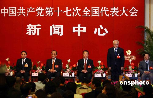 中共十七大新聞中心10月18日晚邀請五位中共黨員部長聯(lián)合接受記者采訪。從左至右依次為教育部部長周濟、衛(wèi)生部常務副部長高強、勞動和社會保障部部長田成平、民政部部長李學舉和建設部副部長仇保興。中新社發(fā) 任晨鳴 攝