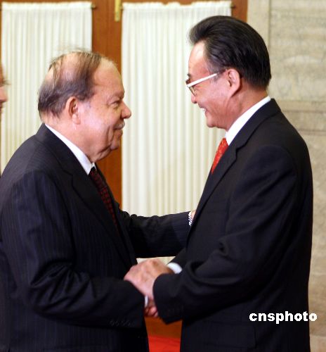 十月二十四日,吳邦國(guó)委員長(zhǎng)在北京人民大會(huì)堂會(huì)見(jiàn)由埃及人民議會(huì)議長(zhǎng)蘇魯爾率領(lǐng)的代表團(tuán)并主持會(huì)談?wù)絾?dòng)雙方交流機(jī)制。中新社發(fā) 任海霞 攝