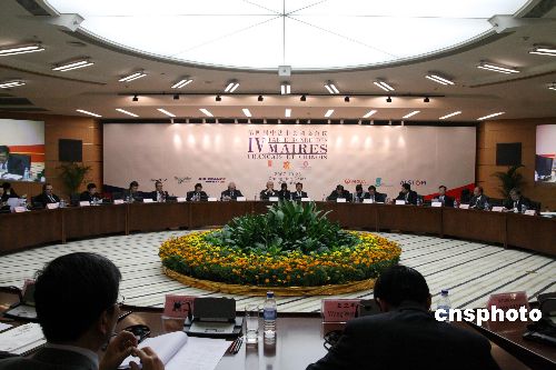 10月26日,第四屆“中法市長(zhǎng)圓桌會(huì)議”在山城重慶拉開帷幕。“中法市長(zhǎng)圓桌會(huì)”由中法兩國(guó)元首倡議于2004年創(chuàng)設(shè),由中國(guó)人民外交學(xué)會(huì)和法國(guó)法中委員會(huì)共同組織,每年輪流在兩國(guó)舉辦。會(huì)議主要圍繞城市規(guī)劃和建設(shè)、可持續(xù)發(fā)展等主題進(jìn)行研討,并就中法城市間的交流、合作、建設(shè)進(jìn)行商洽。中新社發(fā) 郭晉嘉 攝