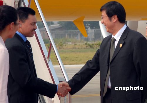 十月二十六日下午,文萊王儲比拉(左二)飛抵廣西南寧市,出席將于十月二十八日開幕的第四屆中國—東盟博覽會。圖為文萊王儲比拉在南寧國際機場受到廣西自治區(qū)黨委宣傳部長沈北海等廣西官員的歡迎。中新社發(fā) 蔣雪林 攝