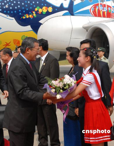 十月二十七日上午,柬埔寨首相洪森飛抵廣西南寧市,出席將于十月二十八日開幕的第四屆中國—東盟博覽會。洪森在南寧國際機場受到當?shù)毓賳T和民眾的熱烈歡迎。中新社發(fā) 蔣雪林 攝
