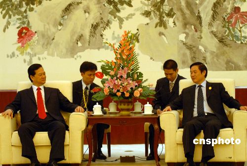 十月二十八日,出席第四屆中國—東盟博覽會(huì)的越南總理阮晉勇,當(dāng)天晚間在與中共廣西壯族自治區(qū)委員會(huì)書記劉奇葆會(huì)見時(shí)說,他鼓勵(lì)更多的越南企業(yè)利用博覽會(huì)打開中國的市場(chǎng)。中新社發(fā) 蔣雪林 攝