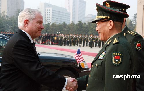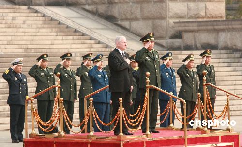 十一月五日,中華人民共和國中央軍委副主席、國務(wù)委員兼國防部長曹剛川在北京舉行儀式歡迎美國國防部長羅伯特·蓋茨訪華。中新社發(fā) 廖文靜 攝