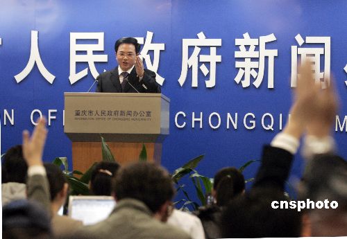 11月15日,重慶市人民政府舉行首場(chǎng)自主新聞發(fā)布會(huì),就三峽移民、交通改造和建設(shè)、醫(yī)療保險(xiǎn)、物價(jià)上漲、城鄉(xiāng)統(tǒng)籌試驗(yàn)區(qū)等當(dāng)?shù)厥忻窈蛧?guó)內(nèi)外媒體關(guān)注的問(wèn)題進(jìn)行回答。重慶市是繼上海市后第二個(gè)舉行自主新聞發(fā)布會(huì)的中國(guó)城市。據(jù)悉,重慶自主新聞發(fā)布會(huì)目前暫定每月一次,定為每個(gè)月的第二個(gè)星期四下午舉行。中新社發(fā) 郭晉嘉 攝