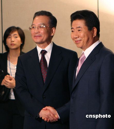中國國務(wù)院總理溫家寶十一月二十日上午在新加坡會見韓國總統(tǒng)盧武鉉。溫家寶表示,中韓在半島及東北亞地區(qū)有著廣泛的共同利益。中方愿繼續(xù)保持同韓方的溝通和配合,共同推動半島無核化進(jìn)程不斷取得新進(jìn)展。中方將一如既往地堅(jiān)定支持南北和解合作進(jìn)程,將積極參與半島和平機(jī)制的建立。中新社發(fā) 周群 攝
