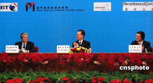 十一月二十八日,第四屆中歐工商峰會(huì)在北京人民大會(huì)堂閉幕。中國國務(wù)院總理溫家寶、歐盟輪值主席國葡萄牙總理蘇格拉底(左)與歐盟委員會(huì)主席巴羅佐(右)共同出席閉幕式。中新社發(fā) 廖文靜 攝