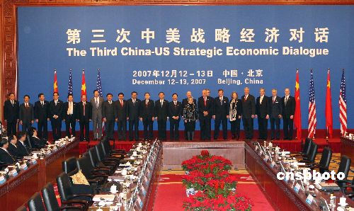 十二月十二日,第三次中美戰(zhàn)略經(jīng)濟(jì)對(duì)話在北京中信國安第一城開幕。會(huì)議開始前,中國國務(wù)院副總理吳儀(前右八)、美國財(cái)長鮑爾森(前右七)與中美參會(huì)部長高官們合影。中新社發(fā) 毛建軍 攝