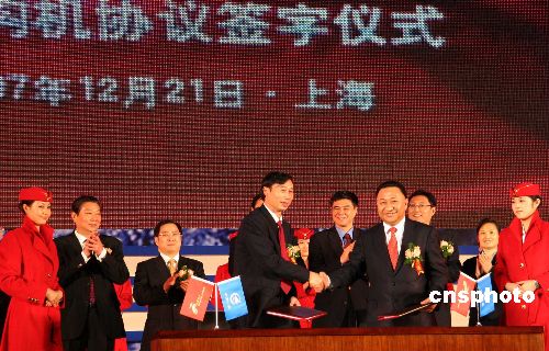 十二月二十一日下午,由中國航空工業(yè)第一集團(tuán)公司(中國一航)自行研制生產(chǎn)的中國首架自主知識產(chǎn)權(quán)噴氣支線客機(jī)ARJ21-700飛機(jī),在上海飛機(jī)制造廠舉行盛大的總裝下線儀式。圖為中國一航總經(jīng)理助理、中國一商用飛機(jī)有限公司總經(jīng)理羅榮懷(左四)與深圳航空公司總裁、鯤鵬航空董事長李昆在儀式上簽署ARJ21飛機(jī)訂購協(xié)議,后者將購買ARJ21飛機(jī)一百架,至此,該飛機(jī)已獲訂單一百七十一架。中新社發(fā) 孫自法 攝