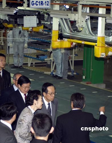 應邀訪華的日本首相福田康夫(左二)在天津市代理市長黃興國(右二)的陪同下,前往位于天津濱海新區(qū)的天津一汽豐田有限公司參觀訪問。