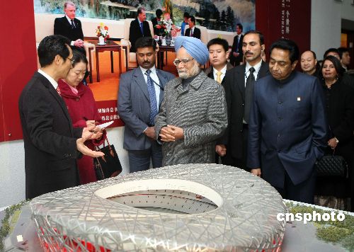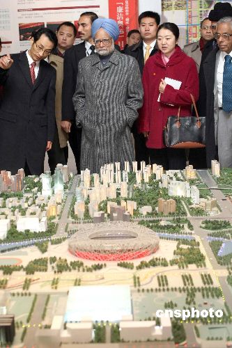 1月13日,印度總理辛格來到北京市“2008”工程展示中心,參觀2008年北京奧運(yùn)會場館建設(shè)。這是辛格擔(dān)任印度總理以來首次訪問中國,也是時(shí)隔五年后印度總理再次來訪。中新社發(fā) 盛佳鵬 攝