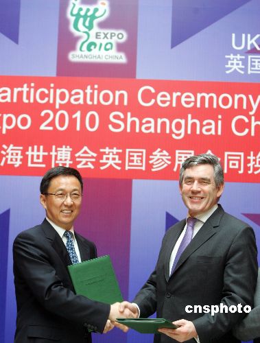 1月19日,上海市市長韓正(左)在上海會見來華訪問的英國首相戈登·布朗。并與布朗互換中國二○一○年上海世博會參展文本。中新社發(fā) 湯彥俊 攝