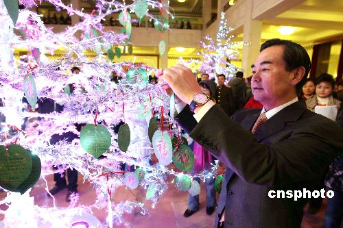 一月二十四日,中國(guó)外交部等在北京人民大會(huì)堂舉辦慰問(wèn)駐外外交人員暨親屬春節(jié)聯(lián)歡會(huì),為他們帶去節(jié)日最真誠(chéng)的祝福。圖為外交部副部長(zhǎng)王毅將祝?☉覓煸谧8(shù)上。中新社發(fā) 任海霞 攝