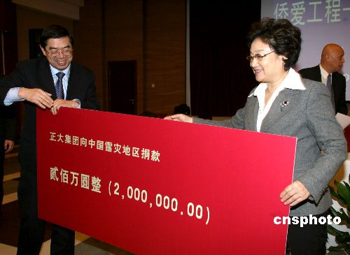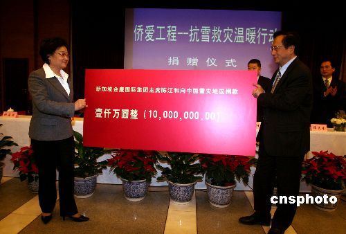 1月31日,新成立的中國僑商投資企業(yè)協(xié)會在北京發(fā)出倡議,希望廣大僑商積極行動起來,為抗雪救災(zāi)伸出援助之手,得到了來自泰國、新加坡、香港、澳門等十多家僑商投資企業(yè)的積極響應(yīng)。 中國僑商投資企業(yè)協(xié)會常務(wù)副會長、新加坡金鷹國際集團(tuán)主席陳江和先生第一個對倡議作出響應(yīng)。在國務(wù)院僑辦舉行的“僑愛工程——抗雪救災(zāi)溫暖行動”捐贈儀式上,陳江和先生慷慨捐贈了1000萬元,中國僑商投資企業(yè)協(xié)會會長、泰國正大集團(tuán)董事長謝國民先生和中國僑商投資企業(yè)協(xié)會副會長、福耀玻璃工業(yè)集團(tuán)董事局主席曹德旺先生分別捐贈了200萬元。目前更多善款還在匯集中。這些款項(xiàng)將通過國務(wù)院僑辦轉(zhuǎn)送受災(zāi)地區(qū)人民政府。國務(wù)院僑辦主任李海峰等出席捐贈儀式。中新社發(fā) 張勤 攝