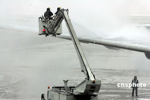 2月2日上午,2008年兩岸春節(jié)包機(jī)上海航點(diǎn)首個(gè)航班——東航MU五00七次航班,冒著數(shù)十年未遇的罕見風(fēng)雪在上海浦東機(jī)場(chǎng)起飛。圖為浦東機(jī)場(chǎng)為春節(jié)包機(jī)優(yōu)先提供特別的除冰服務(wù)。中新社發(fā) 潘索菲 攝
