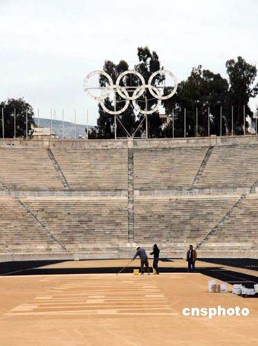 北京奧運(yùn)會圣火采集和火炬?zhèn)鬟f的籌備工作正在希臘緊張地進(jìn)行中。圖為雅典第一屆現(xiàn)代奧運(yùn)會會場正在為即將于本月底舉行的火炬交接儀式做準(zhǔn)備,工人正在體育場中心鋪設(shè)奧運(yùn)五環(huán)標(biāo)志。該體育場能容納兩萬人。中新社發(fā) 鐘誠 攝