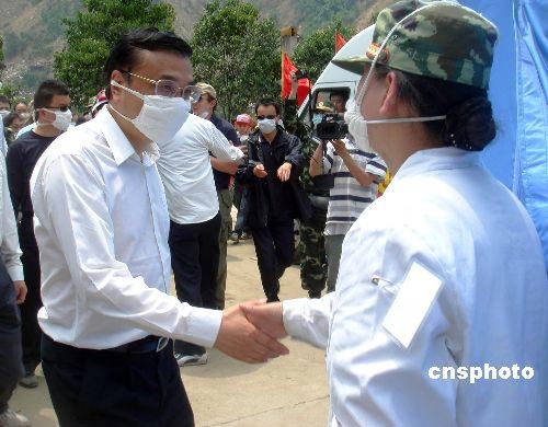 5月19日下午,中共中央政治局常委、國務(wù)院副總理李克強(qiáng)來到北川縣城救災(zāi)現(xiàn)場(chǎng),視察指導(dǎo)現(xiàn)場(chǎng)救援工作,李克強(qiáng)在察看了北川縣受災(zāi)全貌后,慰問了在重慶消防總隊(duì)醫(yī)院在北川縣城救援點(diǎn)設(shè)置的急救帳篷里工作的官兵。中新社發(fā) 陳誠 攝