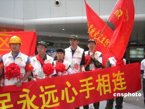 五月二十日,首批海南青年醫(yī)療衛(wèi)生抗震救災(zāi)志愿者服務(wù)隊共二十五人,從?诿捞m機場出發(fā),前往四川綿陽平武縣抗震救災(zāi)。該批具有專業(yè)醫(yī)療技能及抗震經(jīng)驗的志愿者,來自海南省人民醫(yī)院、海南省及各市縣疾控中心,由海南省衛(wèi)生廳及共青團海南省委共同招募。