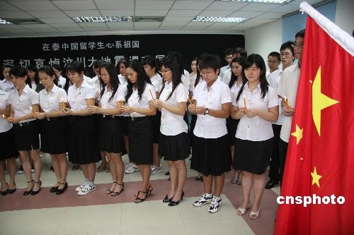 五月二十一日上午,中國駐泰大使館教育組吊唁堂燭光點(diǎn)點(diǎn),哀思眷眷。來自泰國易三倉大學(xué)、亞洲理工學(xué)院、泰國商會(huì)大學(xué)、曼頌德皇家大學(xué)、農(nóng)業(yè)大學(xué)、蘭實(shí)大學(xué)、拉查蒙坤大學(xué)、東亞大學(xué)等曼谷及周邊地區(qū)近十所大學(xué)的六十多名中國留學(xué)生代表,手持點(diǎn)燃的蠟燭,默默地向汶川地震遇難同胞表達(dá)哀悼之情。