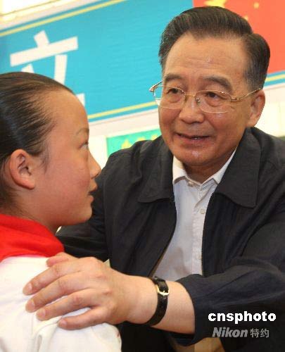 5月23日上午9時(shí)許,國(guó)務(wù)院總理溫家寶來到四川綿陽,在九洲帳篷學(xué)?赐卣馂(zāi)區(qū)學(xué)生。中新社發(fā) 趙振清 攝