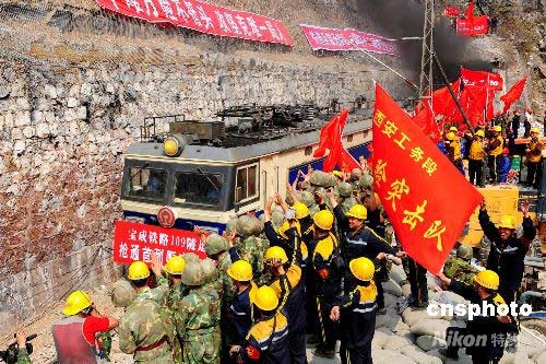 5月24日上午,首列滿載運往四川災(zāi)區(qū)救災(zāi)物資的搶977次列車,從寶成線徽縣至虞關(guān)站間109號隧道安全通過,這標(biāo)志著因地震塌方在隧道內(nèi)脫線起火、中斷行車283小時的寶成鐵路全線,比預(yù)計時間提前7天恢復(fù)通車。 寶成鐵路是通往西南的鐵路大動脈,是四川抗震救災(zāi)的生命線。5月12日14時28分,因四川汶川發(fā)生8級強烈地震引發(fā)山體崩塌,致使運行中的一列貨物列車在西安鐵路局管內(nèi)寶成線徽縣至虞關(guān)站間撞巨石脫線,12節(jié)裝有汽油的罐車被埋在109號隧道中起火燃燒,造成通往四川地震災(zāi)區(qū)的大動脈寶成鐵路中斷行車。險情發(fā)生后,經(jīng)過鐵路職工、解放軍指戰(zhàn)員、武警官兵等2200多名搶險人員連續(xù)12個晝夜奮力搶修,終于將寶成鐵路109號隧道順利搶通。