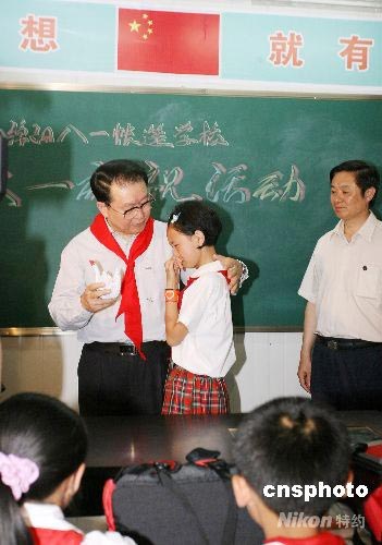 中共中央政治局常委李長春,6月1日赴四川災(zāi)區(qū)看望慰問災(zāi)區(qū)兒童,向?yàn)?zāi)區(qū)轉(zhuǎn)移安置和受傷治療的學(xué)生轉(zhuǎn)交中央宣傳文化部門贈送的十萬臺收音機(jī)和一批少兒讀物及學(xué)習(xí)用品。中新社發(fā) 蒲滔 攝