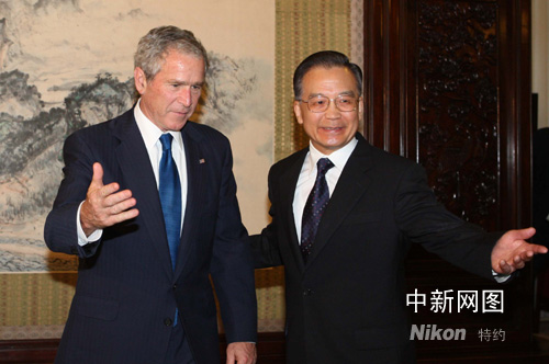 8月10日,中國(guó)國(guó)務(wù)院總理溫家寶在北京中南海會(huì)見(jiàn)美國(guó)總統(tǒng)布什一行。中新社記者 廖文靜攝