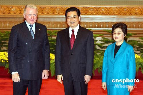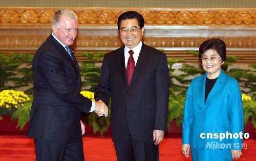 9月6日,國家主席胡錦濤夫婦在北京人民大會(huì)堂歡迎出席2008年殘奧會(huì)的各國貴賓。圖為胡錦濤夫婦歡迎第29屆奧運(yùn)會(huì)協(xié)調(diào)委員會(huì)主席維爾布魯根。中新社發(fā) 任海霞 攝