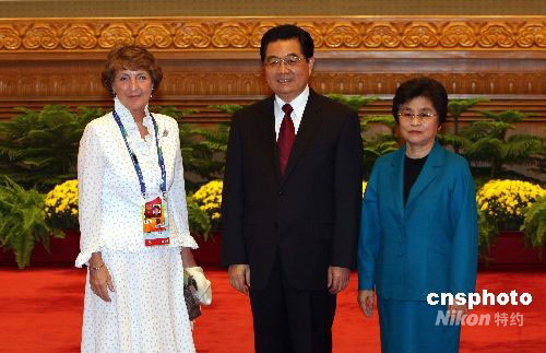 9月6日,中國國家主席胡錦濤夫婦在北京人民大會堂歡迎出席2008年殘奧會的各國貴賓。圖為胡錦濤夫婦歡迎殘奧委會榮譽委員荷蘭公主瑪格麗特。中新社發(fā) 任海霞 攝