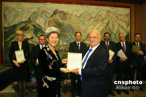 當(dāng)?shù)貢r(shí)間9月25日晚,中國(guó)駐英使館舉行國(guó)慶59周年招待會(huì)。圖為中國(guó)駐英大使傅瑩(左)在招待會(huì)上向英外交部、國(guó)際發(fā)展部、英中貿(mào)協(xié)等機(jī)構(gòu)代表及個(gè)人頒發(fā)中國(guó)民政部四川地震捐贈(zèng)證書(shū)。中新社發(fā) 李鵬 攝