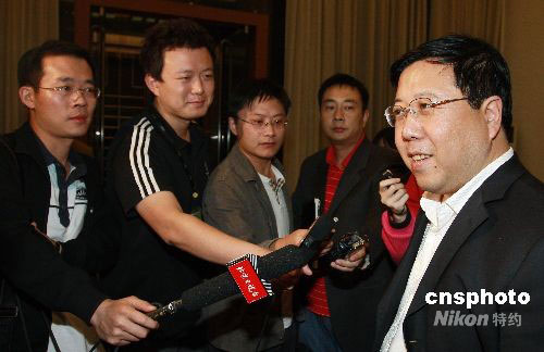 “長征二號F”運(yùn)載火箭總設(shè)計師荊木春在機(jī)場接待廳被記者追蹤采訪。