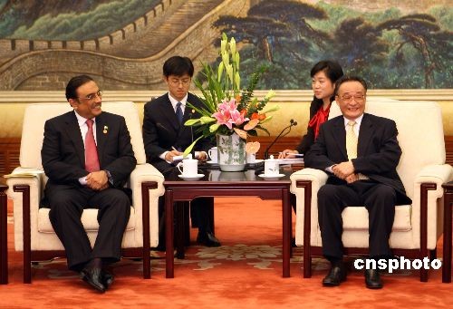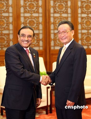 十月十六日,全國(guó)人大常委會(huì)委員長(zhǎng)吳邦國(guó)在北京人民大會(huì)堂會(huì)見巴基斯坦總統(tǒng)扎爾達(dá)里一行。中新社發(fā) 任海霞 攝