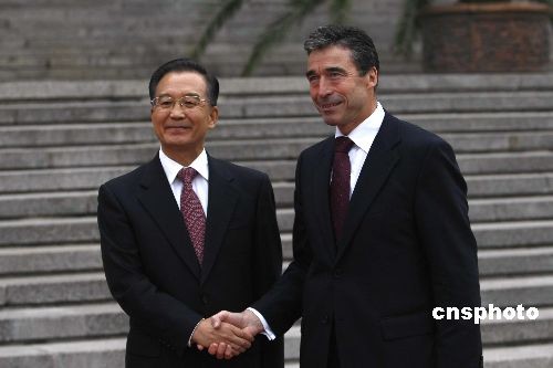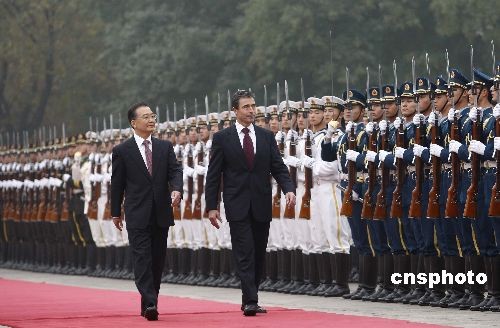 10月22日,中國(guó)國(guó)務(wù)院總理溫家寶在北京人民大會(huì)堂東門外廣場(chǎng)舉行儀式,歡迎丹麥?zhǔn)紫嗬鼓律V行律绨l(fā) 盛佳鵬 攝