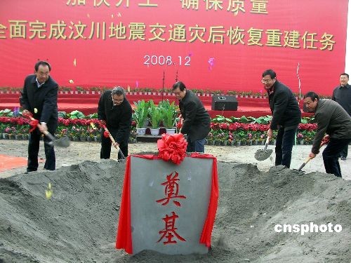 12月3日上午,在四川汶川大地震造成的滑坡山體邊,國道213線汶川至映秀公路的映秀施工現(xiàn)場,汶川地震交通災(zāi)后恢復(fù)重建項目集中開工儀式舉行。交通運輸部部長李盛霖,四川省省長蔣巨峰、副省長王寧,四川省交通廳廳長高烽等,揮锨為國道213線汶川至映秀段、省道303線臥龍至日隆段災(zāi)后重建項目奠基。中新社發(fā) 楊杰 攝