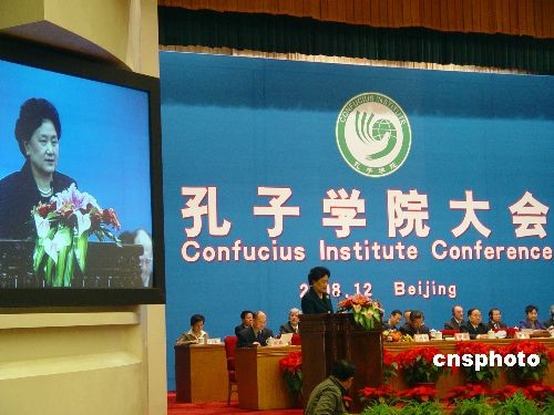 每年舉行一次的孔子學(xué)院大會(huì)十二月九日下午在北京人民大會(huì)堂開幕,中共中央政治局委員、國(guó)務(wù)委員劉延?xùn)|在講話中對(duì)下一步如何辦好孔子學(xué)院,提出了四點(diǎn)建議,即堅(jiān)持辦學(xué)宗旨、注意提高質(zhì)量、鼓勵(lì)探索創(chuàng)新、推動(dòng)平等合作。本屆孔子學(xué)院大會(huì)的主題為“孔子學(xué)院與全球化教育”,來(lái)自七十八個(gè)國(guó)家和地區(qū)的約五百位大學(xué)校長(zhǎng)和孔子學(xué)院代表將在今后的會(huì)議中圍繞漢語(yǔ)推廣與世界多元文化發(fā)展、孔子學(xué)院對(duì)大學(xué)和當(dāng)?shù)氐呢暙I(xiàn)等議題進(jìn)行廣泛交流。中新社發(fā) 應(yīng)妮 攝