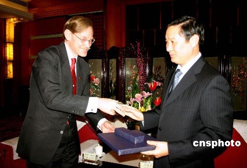 12月14日,世界銀行行長佐利克一行在成都會(huì)見了四川省委書記劉奇葆,兩人就全球經(jīng)濟(jì)危機(jī)影響下雙方在四川災(zāi)后重建和成都統(tǒng)籌試驗(yàn)區(qū)建設(shè)等方面的合作意愿交流了看法。圖為佐利克(左)與劉奇葆(右)互贈(zèng)禮物。中新社發(fā) 黃永莉 攝
