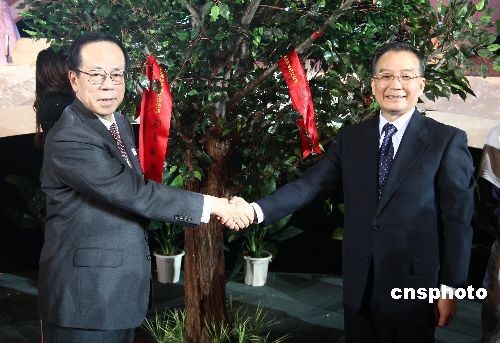 12月20日,“中日青少年友好交流年”閉幕式在北京航空航天大學(xué)舉行,國務(wù)院總理溫家寶和日本前首相福田康夫一起為中日友誼樹系上紅絲帶。溫家寶說,中日青少年相互接觸和交流,就像種子一樣,日后會生根發(fā)芽,象征著中日世代友好的未來。中新社發(fā) 杜洋 攝