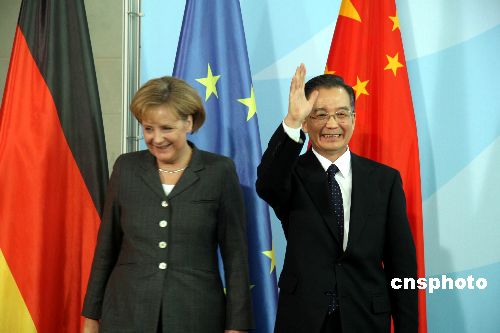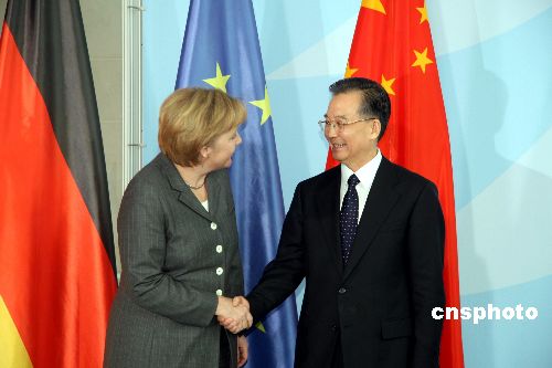 中國國務(wù)院總理溫家寶二十九日在柏林和德國總理默克爾進(jìn)行了會(huì)談,中德兩國簽署了共同努力穩(wěn)定世界經(jīng)濟(jì)形勢(shì)的聯(lián)合聲明和氣候、交通等合作項(xiàng)目文件。中新社發(fā) 吳衛(wèi)中 攝