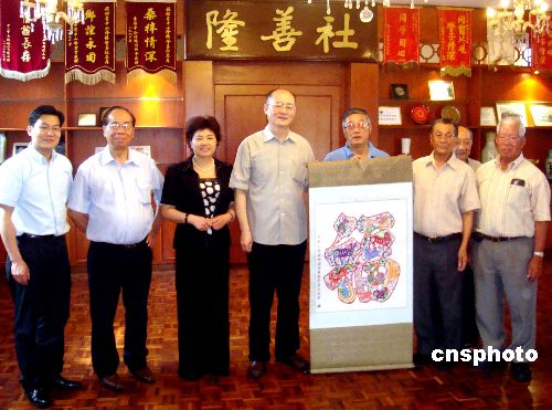 當(dāng)?shù)貢r(shí)間2月2日,率領(lǐng)“文化中國 四海同春”藝術(shù)團(tuán)一行訪問南美的國務(wù)院僑辦副主任、中國海外交流協(xié)會(huì)副會(huì)長趙陽,在秘魯首都利馬走訪僑社,了解僑情,參觀了具有一百多年歷史的中山隆鎮(zhèn)隆善社和同升會(huì)館。圖為趙陽向秘魯中山隆鎮(zhèn)隆善社贈(zèng)送禮品。中新社發(fā) 劉以謙