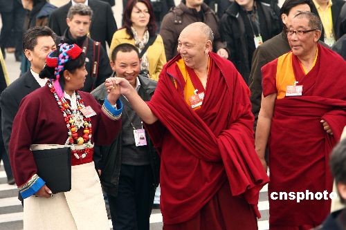 3月3日,全國政協(xié)十一屆二次會(huì)議在北京人民大會(huì)堂開幕。來自西藏的委員攜手出席會(huì)議。中新社發(fā) 杜洋 攝