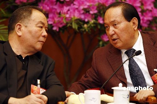 3月5日下午,十一屆全國人大二次會(huì)議審議政府工作報(bào)告,圖為新疆自治區(qū)黨委書記王樂泉與全國人大常委會(huì)副委員長司馬義·鐵力瓦爾地在新疆代表團(tuán)討論會(huì)上交談。中新社發(fā) 盛佳鵬 攝