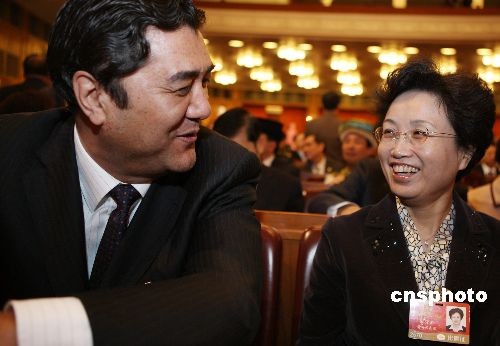 3月9日,十一屆全國人大二次會議第二次全體會議在北京人民大會堂舉行,剛剛利用大會休息日到天津考察鐵路建設(shè)的青海省女省長宋秀巖,向鄰坐的新疆維吾爾自治區(qū)政府主席努爾·白克力請教鐵路建設(shè)的經(jīng)驗(yàn)。中新社發(fā) 任晨鳴 攝