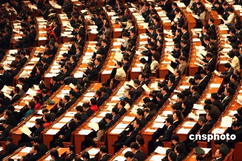 3月9日,十一屆全國人大二次會議在北京人民大會堂舉行第二次全體會議,全國人民代表大會常務(wù)委員會委員長吳邦國作全國人民代表大會常務(wù)委員會工作報告,代表們細聽“政府工作報告解讀”。中新社發(fā) 金立冬 攝